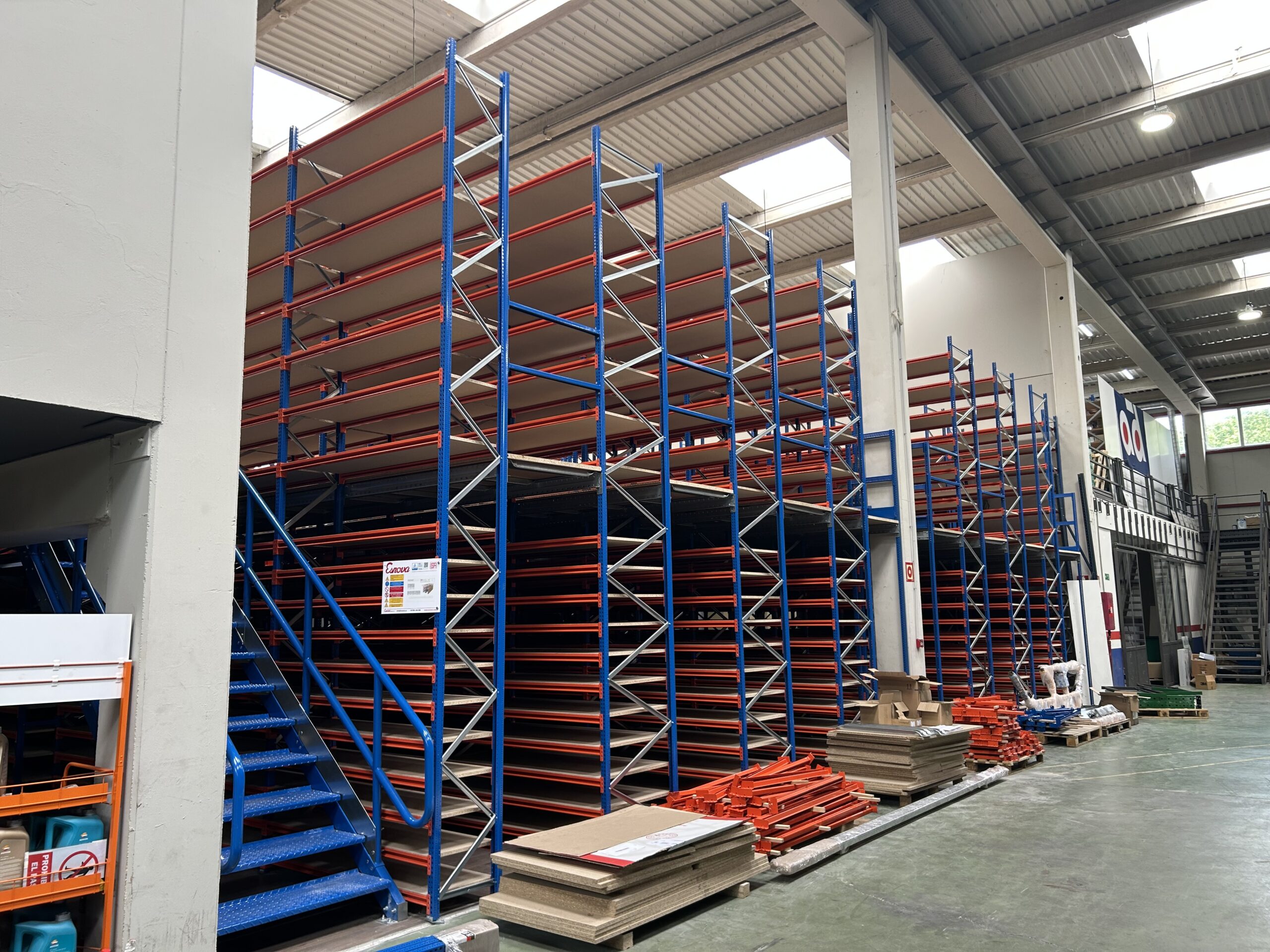 Los sistemas de pasillos elevados permiten aprovechar la altura del almacén sin necesidad de obra civil. Son estructuras modulares que añaden niveles accesibles a pie, duplicando o triplicando la superficie útil disponible.